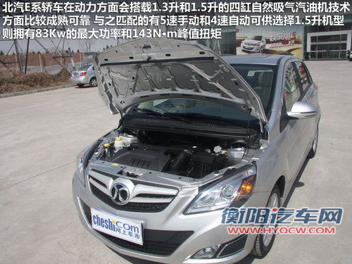 北汽E系轿车在动力方面会搭载1.3升和1.5升的四缸自然吸气汽油机,技术方面比较成熟可靠,与之匹配的有5速手动和4速自动可供选择,其中 1.3升发动机可输出最大功率73Kw、峰值扭矩124N·m,1.5升机型则拥有83Kw的最大功率和143N·m峰值扭矩。