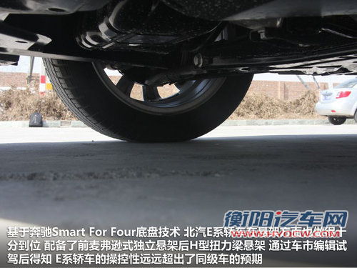基于奔驰Smart For Four底盘技术,北汽E系轿车在悬架方面也做得十分到位,配备了前麦弗逊式独立悬架(集成了横向稳定杆设计)后H型扭力梁悬架。通过车市编辑试驾后得知,E系轿车的操控性远远超出了同级车的预期,在拥堵的市区可以表现得灵活矫健,行车舒适程度也基本令人满意。