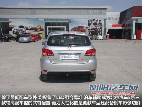 尾部造型设计同样层次感比较分明,与整车造车手法达到了高度的契合, 可以用简约、饱满、时尚动感来形容,其中,高穿透力的LED高位刹车灯及集成了LED元素的尾灯组则是点睛之笔,其中,除了最低配的1.3L乐活手动挡外,均配备了LED组合尾灯。模拟障碍泊车辅助系统成为了北京汽车E系三款较高配车型的共有配置,更为人性化的是此款车型还配备了便利性较高的倒车影像功能。