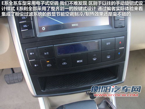 差异化方面主要体现在,四款高配车型则配备了四个喇叭,集成了GPS功能的6.5英寸高清液晶触摸屏成为了1.5L三款车型的共有配置,此款为最高配的旗舰车型,所以还配备了倒车影像功能,这里需要批评的一点是,E系车辆播放功能的兼容性需要进一步改进。E系全系车型采用了电子式空调,通过编者实际体验来看,集成了粉尘过滤系统的数显节能空调制冷/制热效果还是蛮不错的,值得一提的是,通过空调的调节效果。