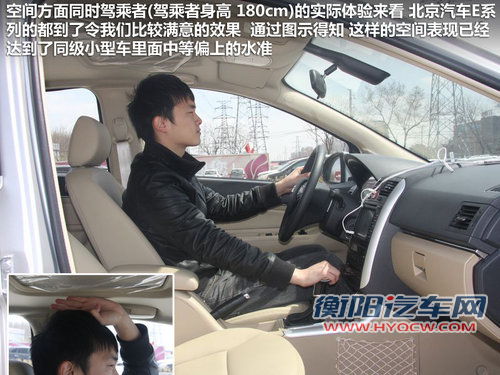 作为家用代步车型,有时尚的外形和丰富的配置还是不够的,宽敞的空间同样是消费者比较关心的购车要素。空间方面同时驾乘者(驾乘者身高 180cm)的实际体验来看,北京汽车E系列的都到了令我们比较满意的效果 ,通过图示得知,这样的空间表现已经达到了同级小型车里面中等偏上的水准。