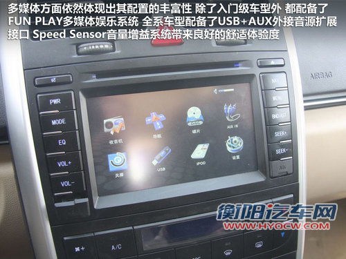 多媒体方面依然体现出其配置的丰富性,除了入门级车型外,都配备了FUN PLAY多媒体娱乐系统,全系车型配备了USB+AUX外接音源扩展接口,Speed Sensor音量增益系统带来良好的舒适体验度。