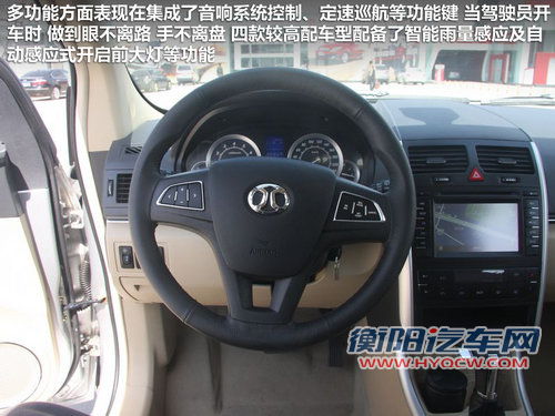 三幅运动型方向盘从造型到做工来看达到了预期的效果,四款较高配车型配备了多功能方向盘,而此款旗舰车型则采用了真皮包裹。多功能方面表现在集成了音响系统控制、定速巡航等功能键,当驾驶员开车时,做到眼不离路,手不离盘,非常便利。前文我们已经提到过,四款较高配车型配备了智能雨量感应系统及自动感应式开启前大灯等功能。