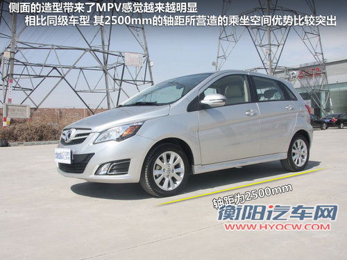就像文中开篇提到过的,这款车型的外观造型,当我们第一眼看到他时, 很容易就和奔驰B级联系到一起,从其车身尺寸来讲,其比奔驰B级小了一圈,它的车身尺寸分别为长3998mm、宽1720mm、高1503mm,轴距为2500mm 。别的优势咱们暂且不看,出于5-8万元的市场售价,其时尚的外形带来了较强的市场竞争力。