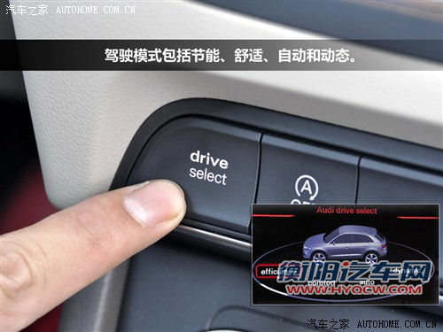 在跟驾驶性能有关的配置方面,眼前的这台奥迪Q3也是相当丰富。车道保持辅助系统、并线辅助系统、自动启停系统、驾驶模式选择、自动泊车系统等功能都可以在它身上找到。驾驶模式选择是很能取悦年轻消费者的配置,它分别有节能、舒适、自动、动态四种模式。其中“节能”是指巡航系统和空调系统会在最经济的状态下工作,而其他三种模式都很容易理解,我就不一一详细介绍了。与奥迪Q5不同的是,Q3用“自动”模式取代了“自定义(Individual)”模式,全靠电脑来自主控制,你不需要为调节而发愁。