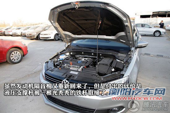 新速腾的动力系统没有变化,上市车型仍将会有1.6L、1.4T和1.8T三种排量,本次拍摄的车型采用1.4T涡轮增压发动机,最大功率96kW/5000rpm,最大扭矩220nm/1750-3500rpm。我们可以看到可喜的是发动机隔音棉重新回来了,可悲的是发动机舱盖液压杆被取消,换成廉价的铁杆支柱。