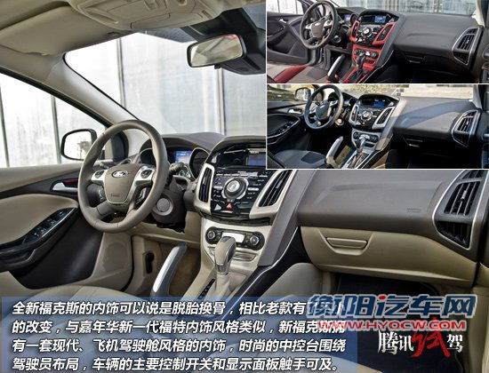 全新福克斯的内饰可以说是脱胎换骨,相比老款有了不小的改变,与嘉年华新一代福特内饰风格类似,新福克斯拥有一套现代、飞机驾驶舱风格的内饰,时尚的中控台围绕驾驶员布局,车辆的主要控制开关和显示面板均近在咫尺、触手可及。