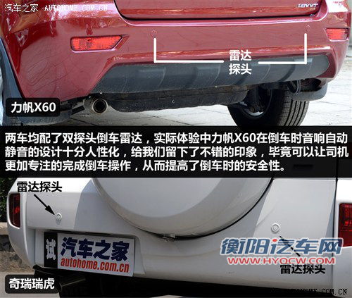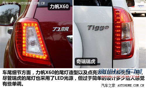 来到车尾,两车延续了各自的特点,力帆X60通过硬朗的直线和棱角继续着粗犷的越野风格,而瑞虎进一步走着它都市SUV的休闲风格。相比之下,我更喜欢力帆的这种颇为阳刚的造型设计,尤其是其梯形的LED尾灯点亮后十分漂亮,比瑞虎简单的竖条造型要更吸引眼球。此外,两车均配了双探头倒车雷达,实际体验过程中,力帆X60在倒车时音响自动静音的设计非常值得称赞,因为它可以减少其他声音对司机的干扰,大大提高倒车时的安全性。