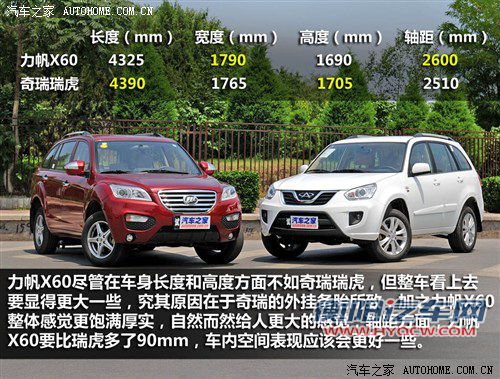 外观方面,虽然瑞虎的三围尺寸要略大一些,但总感觉不如力帆X60看着大,经过我们一番对比后发现瑞虎的外挂式备胎是造成其车身数据虚长的主要原因,加之力帆X60整体造型较为敦实,在视觉造成了偏大的现象。而轴距方面则真实的反映出两车的实际大小,2600mm轴距的力帆X60要比瑞虎多了90mm,应该会比瑞虎有着更好的车内空间表现。