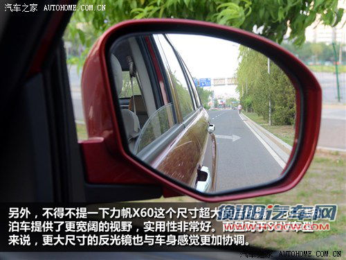 值得一提的是力帆X60的自动大灯配置,在这个价位的SUV中也算是非常少有。另外,力帆X60硕大的后视镜不仅在外观上与硬朗的风格相得益彰,而且在实际使用中也效果也非常不错,视野面积相当宽阔,为行车并线和泊位提供了很大的便利。