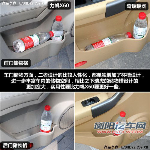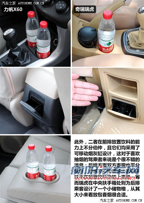 令人比较满意的是,力帆X60和奇瑞瑞虎在饮料槽的设计以及储物格数量上比较周到,前后排都能找到合适的放置饮料的地方,这对于喜欢携家人或朋友外出自驾游的车主们来说显得尤为体贴。
