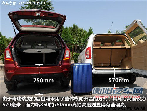 后备厢高度方面,奇瑞瑞虎受益于后备厢横向开合方式,其离地距离仅为570mm在SUV车型中表现数一数二,这在搬运重物时显得相当突出;而力帆X60的离地间隙即便不和瑞虎相比,其750mm的高度在SUV车型中也属偏高。此外,力帆的后备厢门相当沉重,而且后备厢锁也没有采用与车门同步的锁止机构,需要车内按键或用钥匙单独解锁,多少显得有些繁琐。空间方面由于力帆X60的后排座椅可以整体向前翻倒,因此可以获得更为平坦的后备厢拓展空间,在这方面瑞虎则要逊色很多。