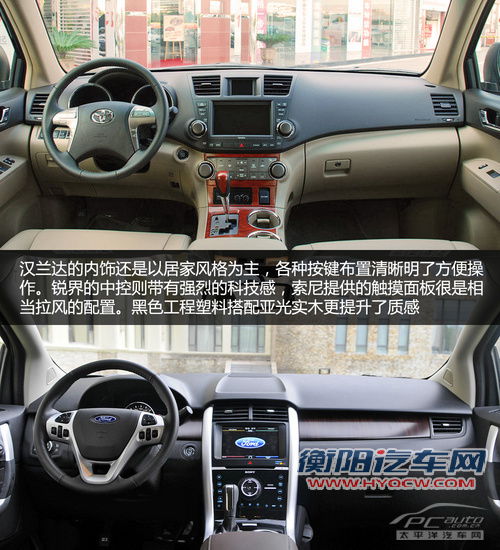 方向盘的手感相差无几,但是论造型,还是锐界的更带感一些。仪表盘的造型也是锐界更胜一筹,两片液晶屏的设计让人立马联想到了比亚迪,相比之下汉兰达显得老气横秋。