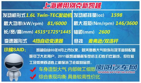 动力方面,2011款凯越仅有一款发动机可以选择,这款1.6L引擎最大功率81kW,最大扭矩146Nm。与之匹配的是一款5速手动变速箱和一款4速自动变速箱。凯越的驾驶特性以平和舒适为主,其加速能力和操控能力都是弱项,相信选购凯越的车主也同样不会将此当做衡量指标。