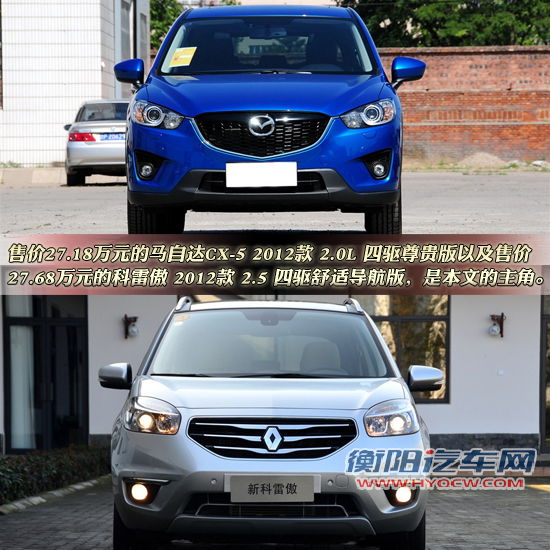 从价格上来说,这两款车都在20万-30万元区间,并且都是原装进口车,在拥有质量保证的同时,性价比也很高。不同的是,科雷傲已经进入中国市场一段时间,积累了不错的口碑,而CX-5才刚刚进入中国市场,并且它的兄长CX-7在中国市场也没有取得预期的市场效果,所以它要面对很大的压力。那么CX-5有实力突破这种压力在中国市场站稳脚跟么,我们选取它的高配车型,售价27.18万元的马自达CX-5 2012款 2.0L 四驱尊贵版来进行分析,而相应的选取售价27.68万 元的科雷傲 2012款 2.5 四驱舒适导航版与之对比,它们也就是本文的两位主角。