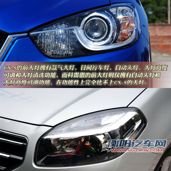 在前大灯方面, CX-5的前大灯拥有氙气大灯,日间行车灯,自动头灯,大灯高度可调和大灯清洗功能,而科雷傲的前大灯则仅拥有自动头灯和大灯高度可调功能,在功能性上完全比不上CX-5的大灯。而在大灯的造型方面,CX-5的大灯也比科雷傲的大灯要更加犀利而运动。