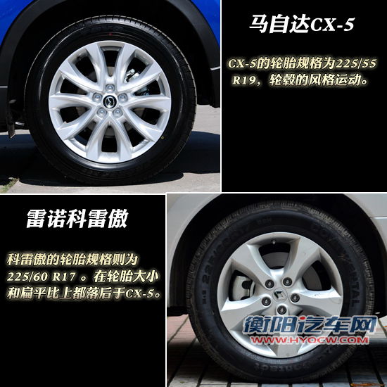 在轮胎方面,CX-5的轮胎规格为225/55 R19 ,而科雷傲的轮胎规格则为225/60 R17 。在轮胎大小和扁平比上都落后于CX-5。另外,CX-5和科雷傲都使用了全尺寸的备胎,比较厚道。