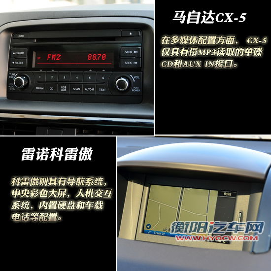 在多媒体配置方面, CX-5仅具有带MP3读取的单碟CD和AUX IN接口,而科雷傲则具有导航系统,中央彩色大屏,人机交互系统,内置硬盘和车载电话等。在这一方面,CX-5没有拿出足够的诚意。
