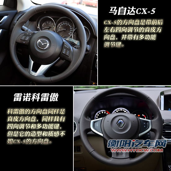 在方向盘方面,CX-5的方向盘是带前后左右四向调节的真皮方向盘,并带有多功能调节键;科雷傲的方向盘同样是真皮方向盘,同样具有四向调节和多功能键,但是它的造型和质感不如CX-5的方向盘,多功能键的功能也不够丰富。