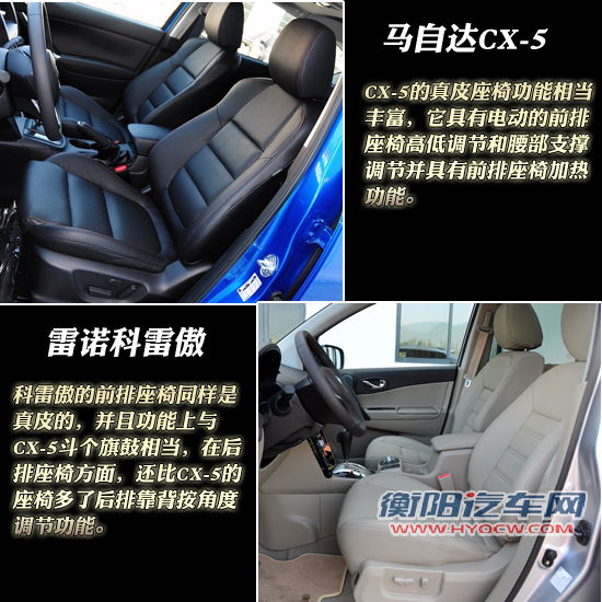 在座椅配置方面,CX-5的真皮座椅功能相当丰富,它具有电动的前排座椅高低调节和腰部支撑调节并具有前排座椅加热功能;而它的后排座椅可以按比例放倒。科雷傲的前排座椅同样是真皮的,并且功能上与CX-5斗个旗鼓相当,在后排座椅方面,还比CX-5的座椅多了后排靠背按角度调节功能。只是它的座椅配色是浅色,没有CX-5的座椅酷。