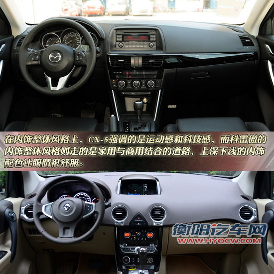 本次对比选取的马自达CX-5 2012款 2.0L 四驱尊贵版和科雷傲 2012款 2.5 四驱舒适导航版都是各自车系里的次顶级车型,所以它们的配置都可以说是相当齐全,笔者在下文中会详细解说这些配置。在内饰整体风格上,CX-5强调的是运动感和科技感,而它的全黑内饰加上黑色的硬质抛光饰条帮它达到了这一效果。而科雷傲的内饰整体风格则走的是家用与商用结合的道路,上深下浅的内饰配色让眼睛很舒服。