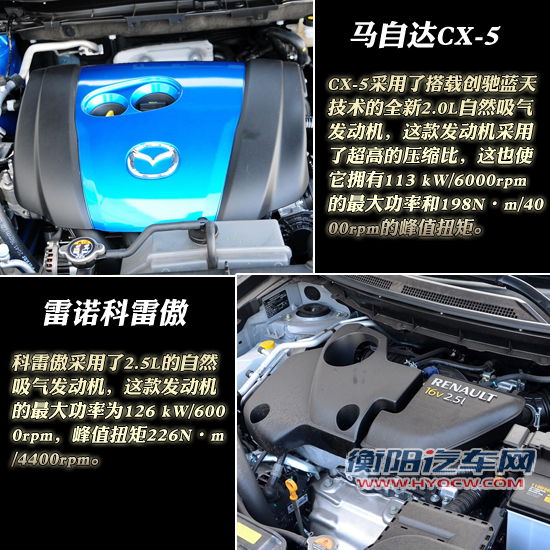 CX-5采用了搭载创驰蓝天技术的全新2.0L自然吸气发动机,这款发动机采用了超高的压缩比,这也使它拥有113 kW/6000rpm的最大功率和198N·m/4000rpm的峰值扭矩,此外它采用了燃油直喷技术,燃油使用效率高,排放低,并且可以使用普通的93号汽油。科雷傲采用了2.5L的自然吸气发动机,这款发动机的最大功率为126 kW/6000rpm,峰值扭矩226N·m/4400rpm。我们可以看到尽管CX-5的发动机排量只有2.0L,但是在数据上与科雷傲的2.5L发动机并没有比较悬殊的差距,这就是创驰蓝天技术的先进之处。