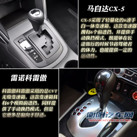 CX-5采用了轻量化的6速手自一体变速箱,这款变速器拥有6个前进挡,并提供手动换挡模式,既能够在长途旅行的时候节省驾驶者的体力,也能提供一定的运动性。科雷傲采用的是CVT无级变速箱,这款变速箱具有6个模拟前进挡,同样提供了手动换挡模式,但是它更多是偏向于舒适,几乎不能给予驾驶者运动的驾驶感觉。