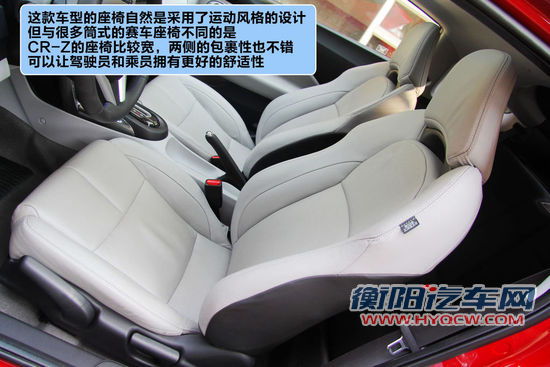 从空间和实用性来看,轿跑定位的CR-Z完全不能与丰田新普锐斯相比,所以我们在此简单介绍一下。本田CR-Z的座椅采用的是运动风格的设计,一体化的设计有点儿赛车的感觉,但坐垫和靠背都比较宽,两侧的包裹性也不错。另外,CR-Z的前排座椅拥有加热功能,所以在舒适性方面也并不是没有优势。
