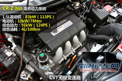 动力系统是将一台1.5L的i-VTEC的发动机配以电机结合成本田IMA混合动力系统,最大功率为91kW(124PS),相当于一款调校不错的1.6L发动机;变速箱系统仅有可模拟6速的CVT变速器可选,国外则还有6速手动变速器。经过各种技术加成,CR-Z的油耗被降低至4L/100km。