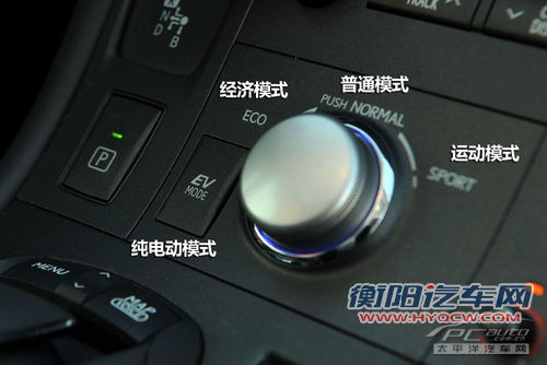驾驶模式需要细说,负责传输动力的变速箱设计非常小巧,手握的档把倒挺有意思,总共有B/D/R/N四个档位,B档即是所谓的低速档,拥堵的市区或者下坡时使用最适合。变速箱旁边还有个行车模式切换旋钮,可分为ECO(节油)、NORMAL(普通)、SPORT(运动)、EV(纯电动)四种模式,启动SPORT模式加强油门的响应速度,同时仪表盘会在瞬间由原来的冰蓝色变成鲜红色。