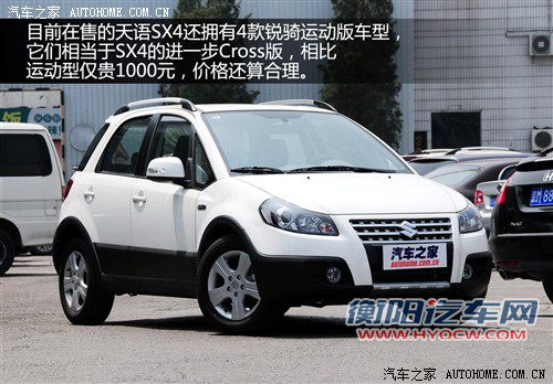 目前在售的天语 SX4又分为2011款的小改款车型和2012款的锐骑运动型,其中2011款小改款车型可以理解为普通版的SX4,而2012款的锐骑运动型则属于SX4深度Cross版本。相同配置下锐骑运动型比普通版运动型贵1000元,用这个价钱买一套运动套件还是值得的,前提是你确实认为锐骑运动型比普通版运动型更好看(我保留意见=。=)。
