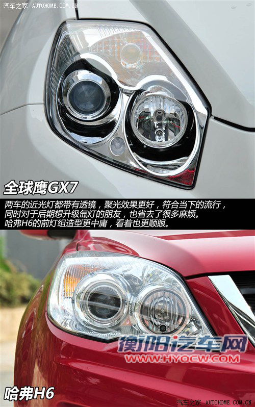 在前大灯组方面,全球鹰GX7与哈弗H6的近光灯都带有透镜,不但更有利于聚光而且对日后想升级氙气的朋友,也省去了很多麻烦。不过就前灯组的造型而言,哈弗H6中庸的设计更讨巧,看着更顺眼。而全球鹰GX7的大灯轮廓用了太多的直线条,看着有点木讷。