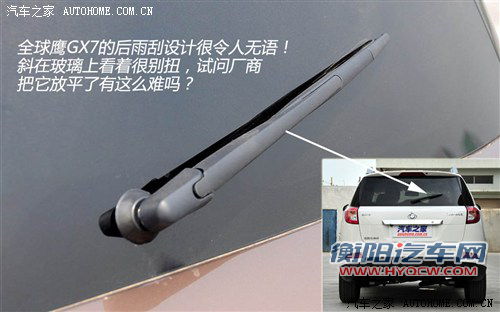 在拍摄全球鹰GX7的时候,我看到它后雨刮斜在那边还以为是没有关到位,我在车内反复拨弄了后雨刮开关多次发现,前面并非没有关到位,而是全球鹰GX7的后雨刮设计就这样,这让我觉得很无语!为什么要这样斜在玻璃上呢,像大部分车一样放平很难吗?
