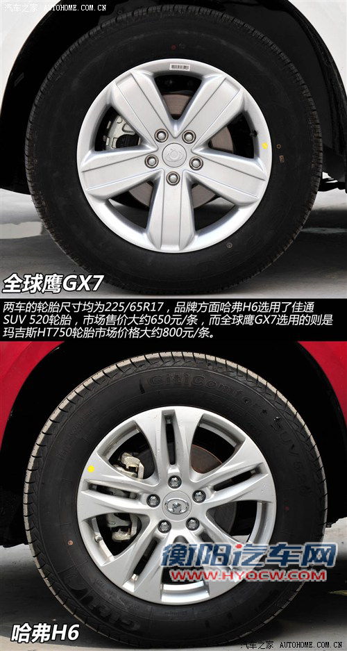 轮胎方面,全球鹰GX7与哈弗H6两车的轮胎尺寸完全一样,都为225/65R17。品牌方面哈弗H6选用了佳通GitiComfort SUV520轮胎,市场售价大约650元/条,而全球鹰GX7选用的则是玛吉斯HT750轮胎,市场价格大约800元/条。从档次上看,两款轮胎的差距并不大。