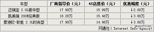 目前三款车型在市场中都有着不小的优惠幅度,其中迈锐宝2.0L豪华型优惠2万,现售价15.99万。凯美瑞200E经典版优惠3.8万,现售价15.48万。蒙迪欧致胜2.3L时尚型优惠3万,现售价14.98万,三款车型的优惠幅度较之前都有所增加。