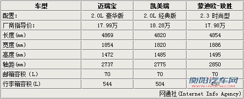 在18万元左右的中级车售价中,我们挑选了三款较为热门的车型,包括美系较为热门的雪佛兰新贵迈锐宝,日系车型中较为热门的凯美瑞经典,以及福特旗下的热销车型蒙迪欧-致胜。相比其他两款车型,其中迈锐宝在车身长度级行李箱容积上具有一定的优势,其他参数都比较均衡。