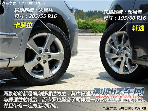 两款车型配备的均为16寸铝合金轮毂,轮胎方面轩逸1.8XL CVT豪华版采用了来自邓禄普 SP SPORT 270的195/60 R16规格轮胎,该轮胎在舒服性及静音性方面均有较好的表现;而卡罗拉1.8L GLX-i CVT配备了米其林NERGY MXV8 规格为205/55 R16轮胎,其除了注重舒适性方面,也有一定的运动取向。