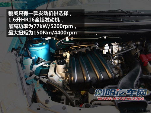 骊威只有一款发动机供选择,日产的1.6升HR16全铝发动机,提供最高功率为77kW/5200rpm,最大扭矩为150Nm/4400rpm,推动整备质量只有1.1吨的车体还是很轻松的,而其所匹配的4挡自动变速器和5挡手动变速器也是小型车中常见水平。