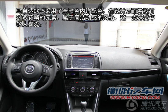 马自达CX-5在内饰设计方面并没有过多花哨的元素,却足够耐人寻味,主体风格依然得到家族化传承,全黑色内饰配色,简洁动感的风格,很好地迎合了年轻人的口味。CX-5这款四驱高配车型上配备了牵引力控制系统和弯道辅助照明系统,除此之外,还配备有马自达独创的i-stop智能怠速停止系统,在遇到红灯或交通拥堵时,它会自动停止发动机运转,并在车辆重新起步时自动点火,从而提升了节油性能。