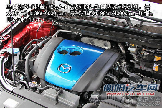 CX-5是马自达推出的首款在发动机、变速箱、车身和底盘方面全面采用创驰蓝天技术的量产车型。2.0L““创驰蓝天汽油发动机”可充分发挥低转速大扭矩特性,最大扭矩为200Nm/4,000rpm,最大功率可达114KW/6,000rpm(两驱车型);搭载在四驱版车型上可得到113KW/6000rpm的最大功率和198Nm/4000rpm的最大扭矩。与之搭配的是“创驰蓝天6速自动变速箱”,可提供更直观、敏捷的变速感受。底盘悬挂方面CX-5采用全新开发的前支撑杆、后多连杆悬挂,马自达通过对悬挂系统的优化设计,可在中低速时实现轻快、线性的动态响应并且能够保障高速行驶时的卓越稳定性。