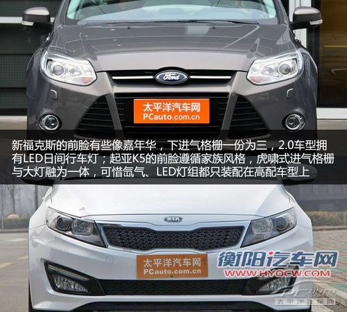 新福克斯的在2.0L排量的车型上配备了氙气大灯+LED日间行车灯,可惜是选配项,不过另一个可变进气格栅,则是其笑傲紧凑车市场的利器;起亚K5的虎啸式前脸很拉风,大灯的样子也相当唬人,硕大的镀铬格栅也很讨喜,整体还是比较大气的。