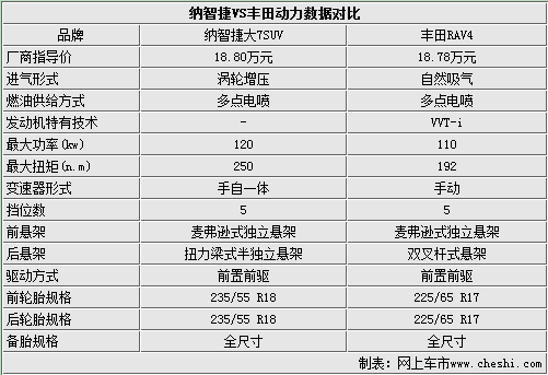 首先我们来看售价为18.8-18.78万元的纳智捷大7SUV与丰田的RAV4车型,它们的基本参数上差别很大,首先纳智捷车型为涡轮增压车型,RAV4则选择了自然吸气发动机作为其核心动力。最大功率以及最大扭矩方面,纳智捷大7SUV在该价位几乎完胜对手。而这个价位上出现的最大偏差,则在与纳智捷车型为5速自动变速箱,而RAV4则为5速手动变速箱。