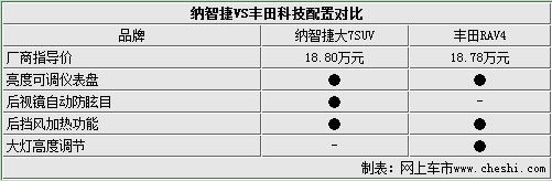 在科技性配置方面,纳智捷大7SUV配备了亮度可调仪表盘,后视镜防眩目、后风挡加热功能。而RAV4也配备了亮度可调仪表盘、后风挡加热功能及大灯高度调节功能。