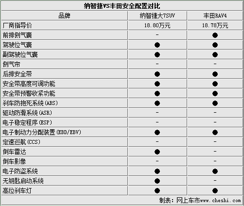 在安全性配置方面,两款车型则大致相差不大,但纳智捷车型少了前排侧气囊这一配置。而无钥匙启动系统和倒车雷达这两项比较实用且养眼的配置,在纳智捷车型上出现,而同竞争区间的RAV4车型暂时在这一配置没有配备。