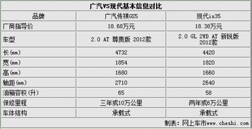 在基本数据对比方面,广汽传祺GS5与北京现代ix35车型官方指导售价也非常接近。两者均都采用了发动机前置,前轮驱动的动力布局。当然传祺GS5在整车尺寸方面又更胜一筹,以4732mm的整车车长,2710mm的轴距超过了同价位的4420mm车长,2640mm轴距的北京现代ix35车型。而传祺GS5更是三年或10万公里保修,但北京现代ix35车型则为两年或6万公里。