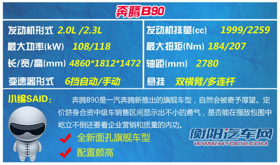 官方称奔腾B90是基于一汽自主研发的全新M2轿跑车平台技术,其实是借鉴马自达6睿翼平台设计,但B90并未完全参照睿翼的尺寸研发,长宽高和轴距都有所加大,分别达到4860/1812/1472mm。轴距达到2780mm,增加55mm,提升了后排空间。