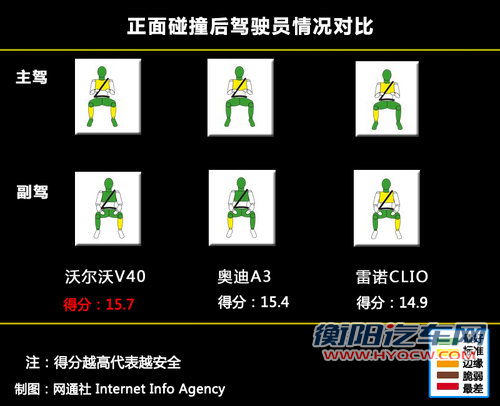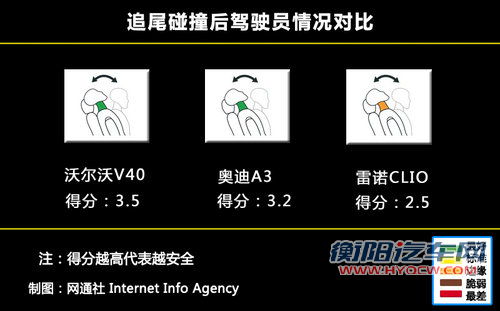 追尾事故也是比较常见的车辆事故之一,在追尾事故发生的过程中最容易收到伤害的部位是乘员的颈部,在这三款A级车中沃尔沃V40和奥迪A3的表现均非常出色,不过雷诺Clio只是达到了评定的边缘水平。
