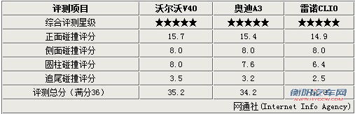 本期列举了三款同属豪华品牌的A级车型,分别为沃尔沃V40、奥迪A3和雷诺Clio。从上表可以看到这三款车型均达到了NCAP五星碰撞标准,这也说明豪华品牌在安全性能上给予了足够的重视。当然即便是达到五颗星在局部碰撞方面三款车的表现也还是存在一定差异,下面就让我们来详细了解下。