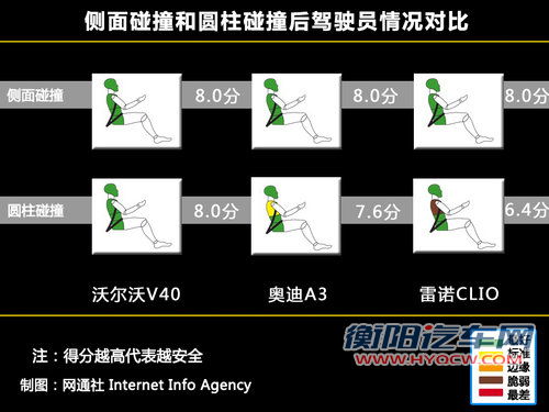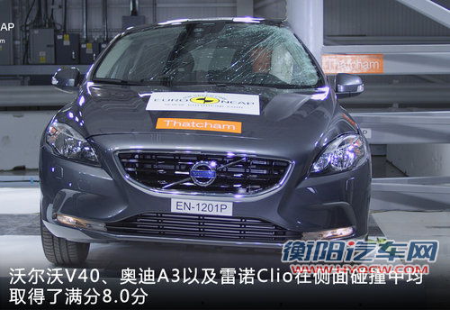 三款车型在侧面碰撞测试中均取得了满分8.0分的优异成绩,而在圆柱碰撞测试中除了V40取得了满分外给予了车内车内乘员全方位的保护,奥迪A3和雷诺Clio分别取得了7.6分和6.4分还有待提升。(测试方式:在侧面碰撞测试中撞击物会以50km/h的速度撞击车辆侧面,来测试侧面撞击对驾驶员身体的伤害和车辆的毁坏程度。而在圆柱碰撞测试中,带有硬物的铁杆将会以29km/h的速度撞击车体,因为体积小可以直接撞击到测试的有效部位。)