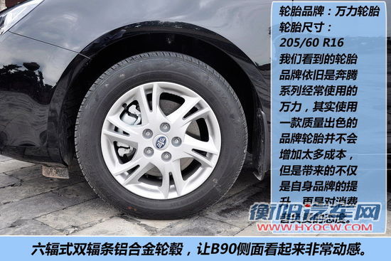 奔腾B90采用万力轮胎,算是国产胎中性能不错的,主要在广汽理念、中华全系车型中使用。尺寸为205/60 R16,与普通的55的宽高比不同,胎壁比较厚,能够适应更多的路况。